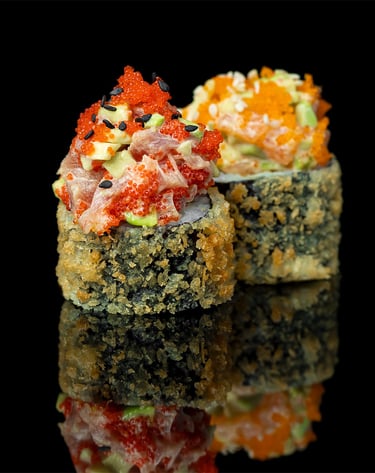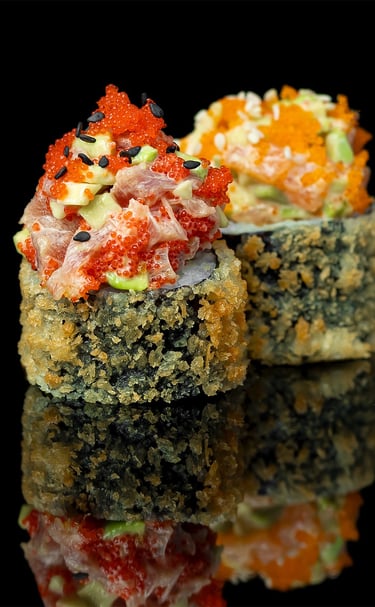 Apkepti sushi – traškūs, apkepti sushi su skirtingais skonių deriniais viduje.